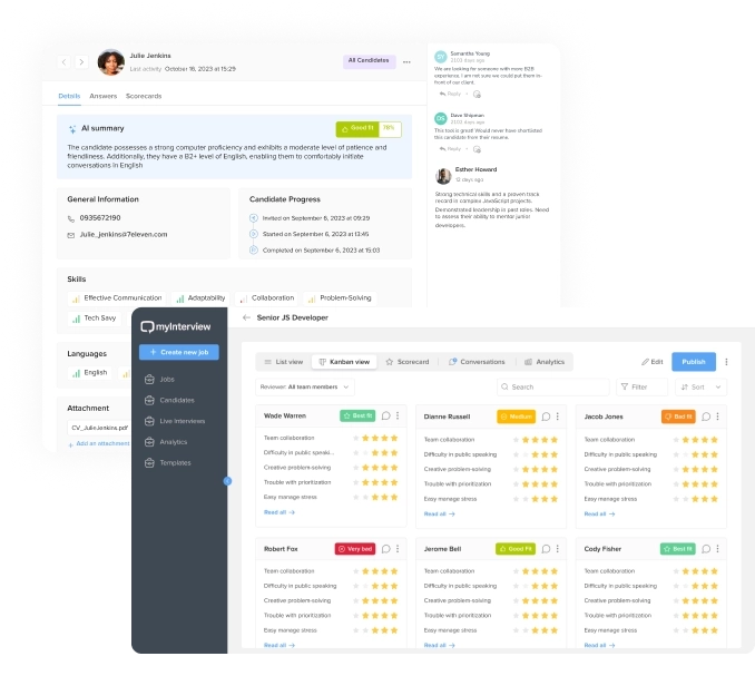 Enhance your hiring with seamless video interviews that let candidates record at their convenience, while AI helps screen and score the videos. Review interviews on any device, save time on scheduling, and quickly identify top talent, all in one streamlined process.Request demo